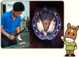 これは「蹄鉄(ていてつ)」といって、ウマのクツです。熱した鉄の棒をたたいて、ウマの蹄(ひづめ)に合う形にし、クギを打ってとめます。痛くないところにとめるので大丈夫。ウマは人をよけることから、交通安全のお守りになったりもしますよ。