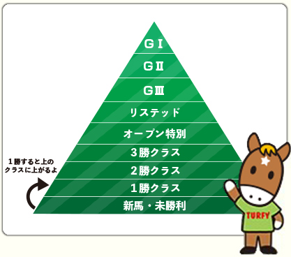 レースはいくつかのクラスに分けられており、特に重要なレースは「格」を表す記号として「GRADE(グレード)」の頭文字である「G」を使用した名前がつけられています。日本ダービーや有馬記念といった、もっとも重要なレースは「GⅠ」に格付けされています。