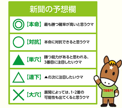 同じレースに出走するウマの中で1番勝つ確率が高いと思うウマを「本命」といい、1頭だけを選びます。他にも「〇」「▲」「△」「×」など、新聞の予想欄にはいろいろな印があります。