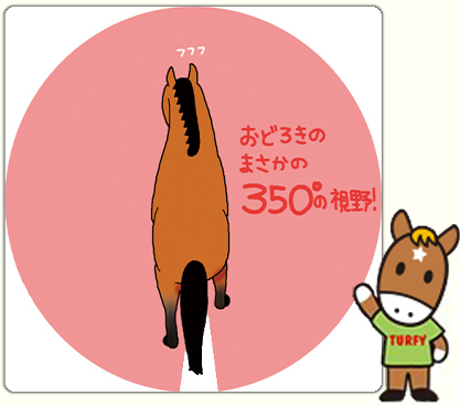 ウマの視野の広さはおどろきの350度!自分の後ろ脚まで見ることが出来ます。ただし真後ろが見えない分、急に尻尾を触ったりすると驚いてしまうので、ウマの後ろを通る際には注意してくださいね。