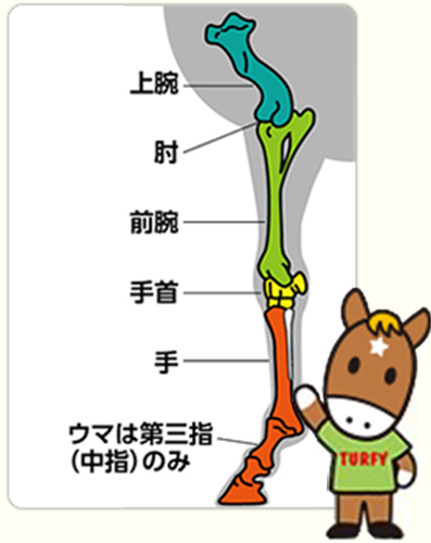 ウマは速く走るため、人間でいうところの中指以外の指が退化したと言われています。図のように足の付け根に見える部分が肘、肘のように見えるところが手首、その先が手と中指になっているのですよ。