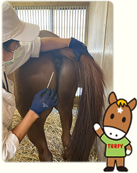 ウマの体温は、お尻に体温計を入れて測ります。レース直後の競走馬の体温は43℃を超えるとも言われますので、JRAでは、レース後すぐに馬体を水で冷やすよう努めています。 ※落下破損時の安全のため、現在は水銀体温計から電子体温計の使用へ移行しています。