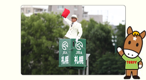 レースの際、ウマが驚いてしまうので大きな音は鳴らしません。スタート前に「スターター」が赤い旗を振っていますが、それを合図に各馬がゲートに入ります。全馬がゲートに入ったことを確認したスターターがゲートを開けることで、レーススタートとなります。