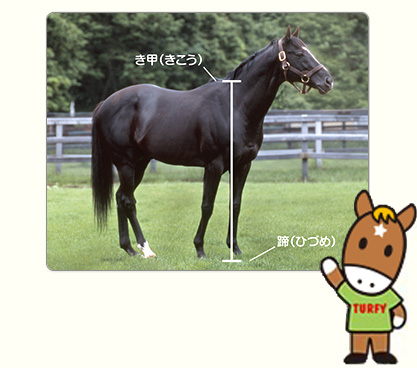 背中の一番前、首の付け根あたりに少し出っ張っている「キ甲(きこう)」という部分があります。地面からキ甲までの高さを図ったものがその馬の体高となります。