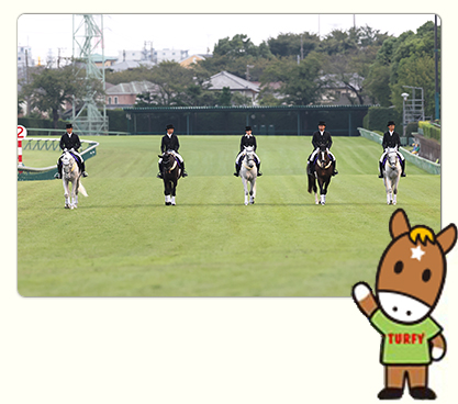 レースに出走する馬が馬場に入場する際の安全確保のために、誘導馬がいます。元競走馬で、年齢を重ね落ち着いた性格になった馬も現役の出走馬たちを誘導します。以前は芦毛の白い馬が中心でしたが、いまはさまざまな毛色の誘導馬がいます。