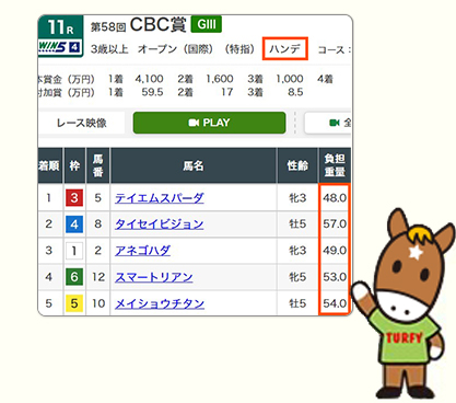 出走馬が背負う重さ(負担重量)はレースごとに決められています。ハンデ戦(ハンデキャップ競走)は、出走馬すべてに勝つチャンスを与えようと、ウマの能力に応じて重量を増減させるレースです。