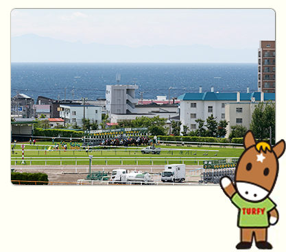 函館競馬場のスタンドからは津軽海峡を見晴らすことができます。視線を移せば函館山も望めるなど、素晴らしいロケーションが魅力のひとつです。